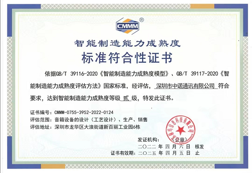 2021年9月-10月,由電子標(biāo)準(zhǔn)院授權(quán)江蘇赫瑪信息科技有限公司組建團隊,基于GB/T 39116-2020《智能制造能力成熟度模型》、GB/T 39117-2020《智能制造能力成熟度評估方法》國家標(biāo)準(zhǔn),對中諾通訊新百麗工業(yè)園從工廠設(shè)計、產(chǎn)品研發(fā)、工藝設(shè)計、計劃與調(diào)度、生產(chǎn)作業(yè)、倉儲配送、質(zhì)量管控、設(shè)備管理、安全管控、能源管理、環(huán)保管理等20個能力子域的智能制造能力成熟度,通過人員交流、現(xiàn)場巡視、系統(tǒng)查看等方法進行評估,認(rèn)定該公司智能制造能力成熟度達到貳級水平,得到國家認(rèn)可。