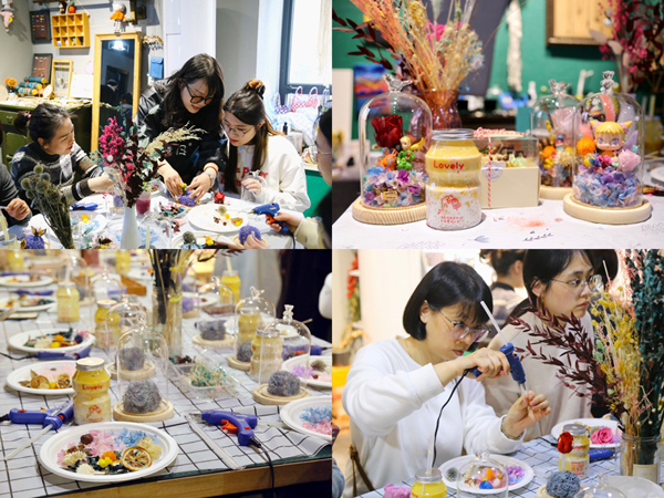活動現(xiàn)場,花藝師就如何安放主花、固定花瓣、插花造型等步驟和技巧等進行了詳細講解。大家選擇好心儀的花材,充分發(fā)揮創(chuàng)意和想象力,精心將每一朵花、每一片葉插放和鋪貼,使原本樸實無華的花托瞬間花團錦簇、生機盎然?;顒又校蠹夷闱魄莆业?,我看看你的,相互交流搭配心得,在歡聲笑語中完成了一份份精美且獨一無二的永生花作品。大家手捧親手制作的永生花合影留念,定格美好瞬間。